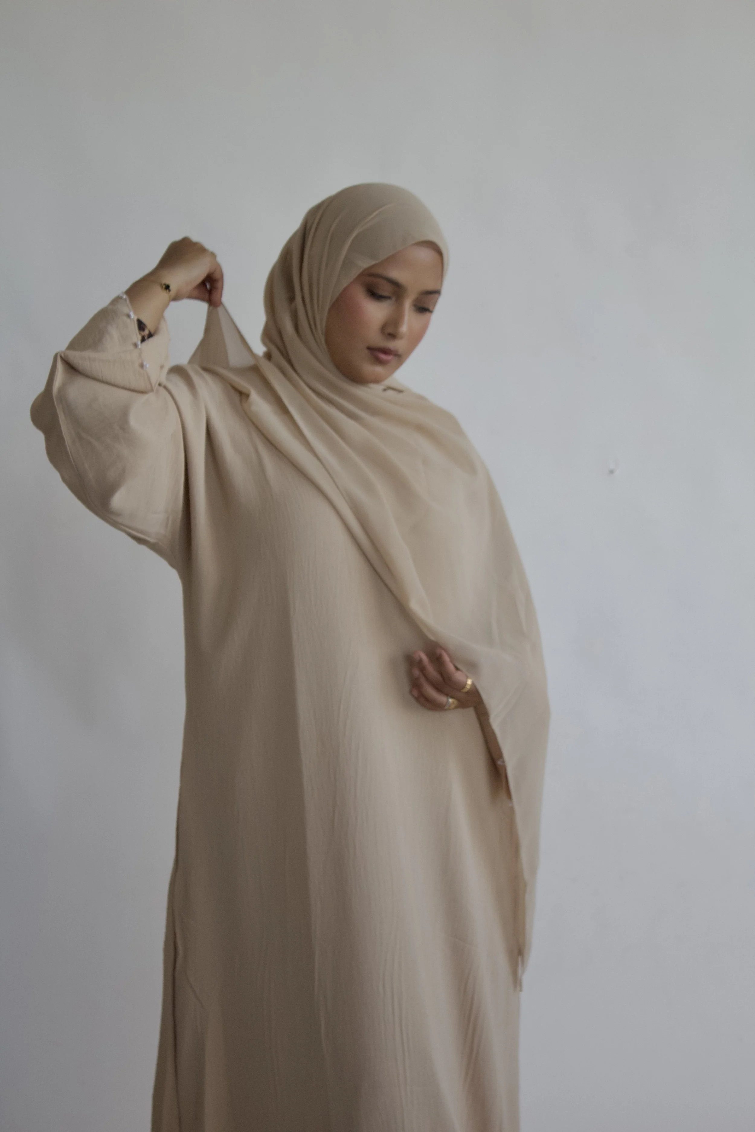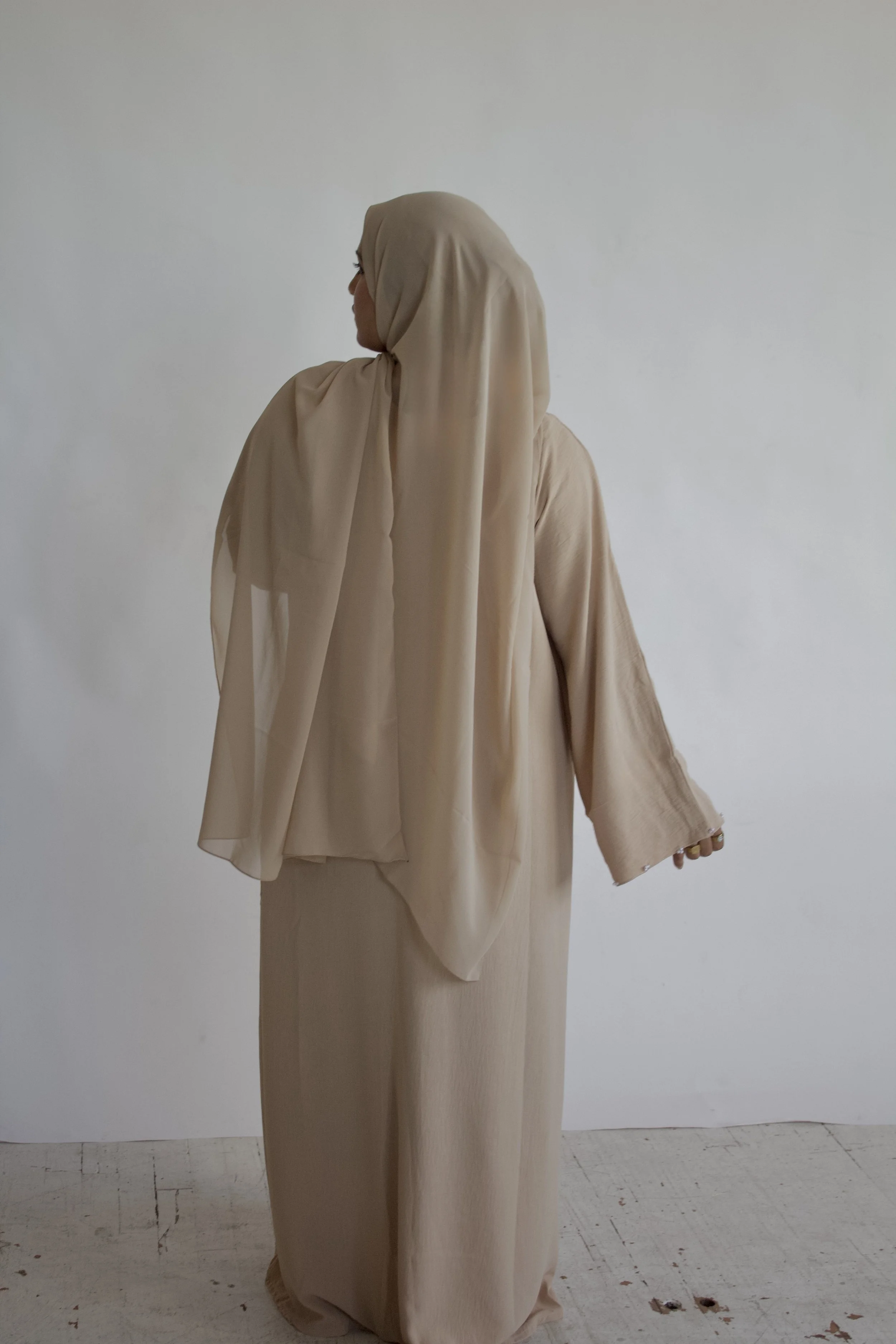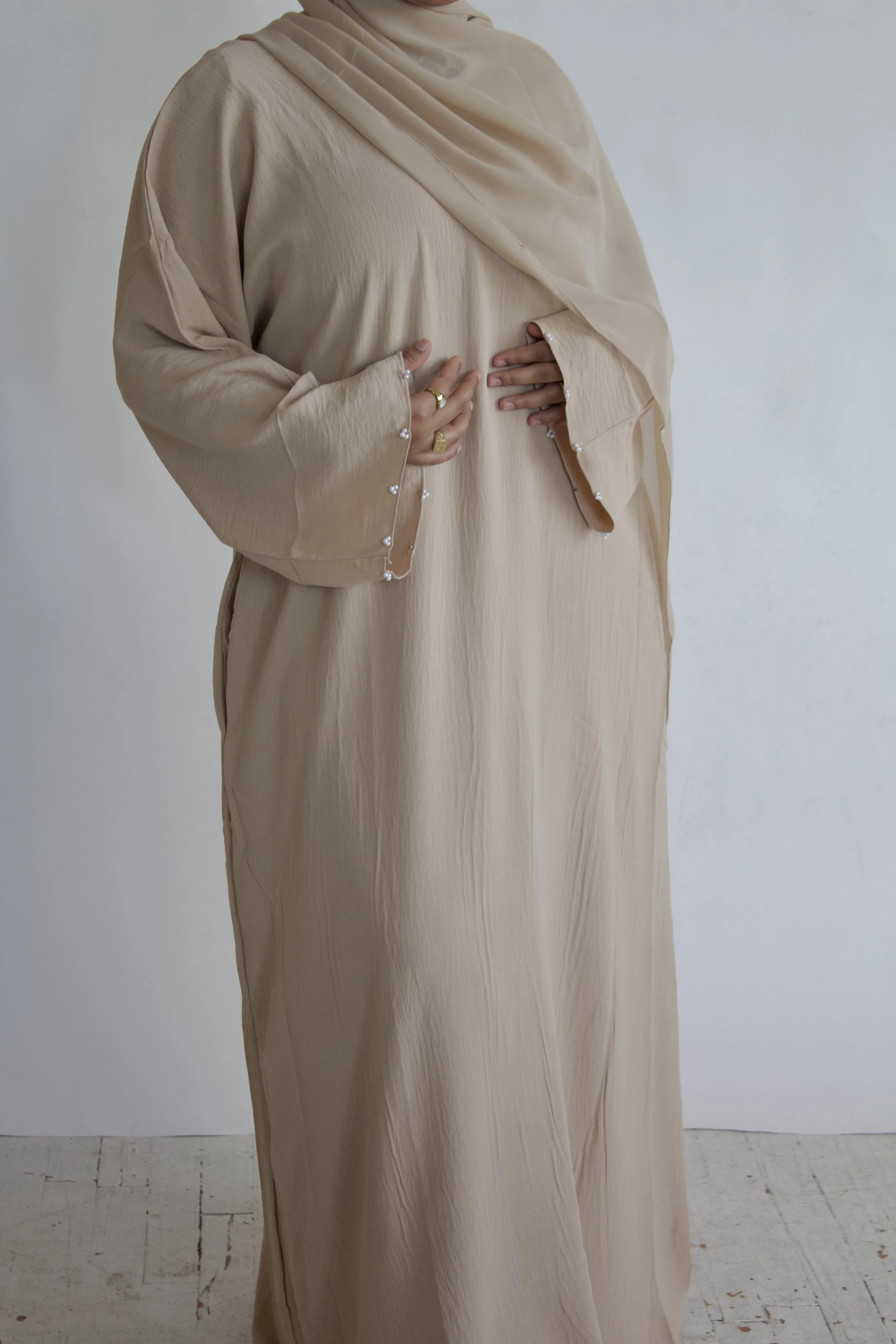 Made from soft CY fabric, this simple abaya features delicate hand-beaded detailing on the sleeves and practical pockets for everyday convenience. Designed for comfort and subtle sophistication.